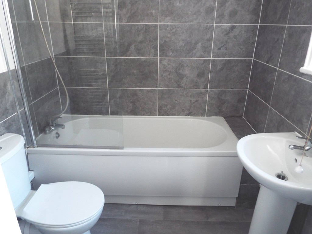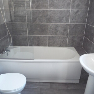 BATHROOM 6′ 2" x 5′ 9" (1.88m x 1.75m) With a panelled bath having mixer tap and shower attached with screen, pedestal wash hand basin with mixer tap, low level WC, bath walls are fully-tiled and further wall part-tiled, uPVC obscured double glazed window which overlooks the side, chrome wall-mounted radiator.