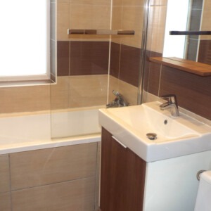 BATHROOM 2 8′ 3" x 5′ 2" (2.51m x 1.57m) With a bath having mixer tap and shower attached with screen, vanity wash hand basin with mixer tap, low level WC, uPVC obscured double glazed window which overlooks the front, wall-mounted heated towel rail/radiator, tiled flooring, downlighters.