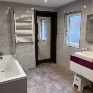 GROUND FLOOR BATHROOM 1 10′ 3" x 7′ 11" (3.12m x 2.41m) Which has underfloor heating, bath with tiled side, mixer tap and shower attached with shower screen, vanity wash hand basin with mixer tap, low level WC, tiled-flooring, downlighters, uPVC obscured double glazed window which overlooks the side, wall-mounted mirror/lighting, combined heated wall-mounted towel rail/radiator.