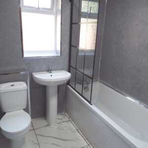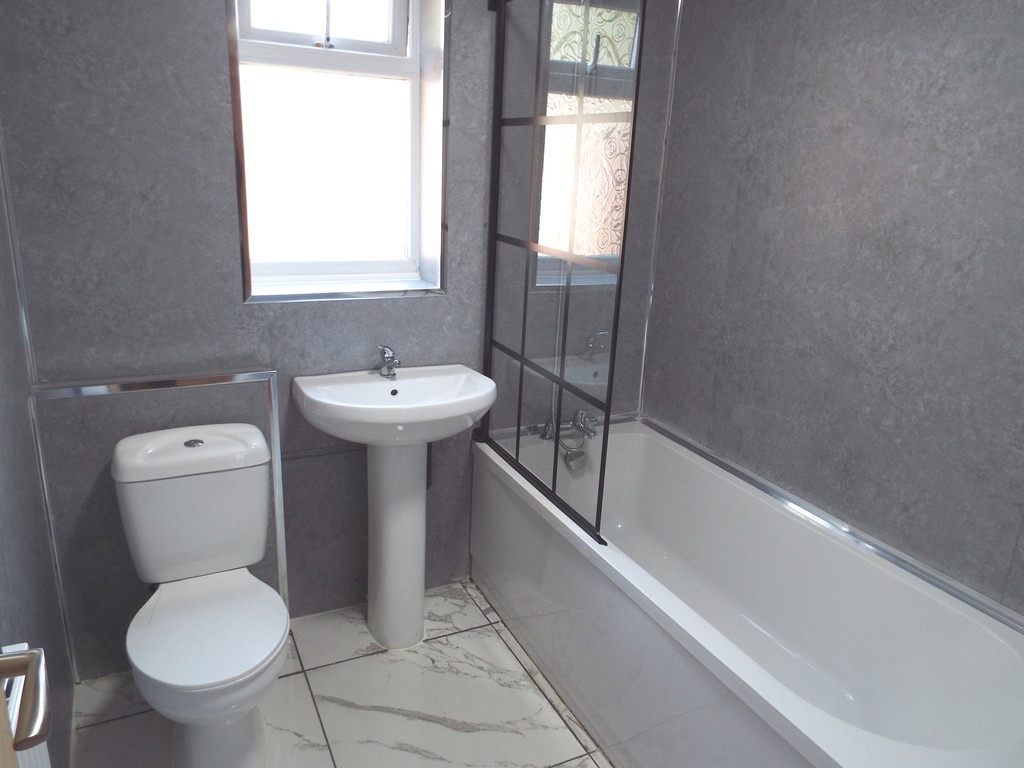 BATHROOM 6′ 9" x 6′ 3" (2.06m x 1.91m) With a panelled bath having mixer tap with shower attached and shower over with screen, pedestal wash hand basin with mixer tap, low level WC, uPVC double glazed obscured window which overlooks the rear, single central heating radiator, tiled flooring.