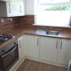 KITCHEN 8′ 5" x 7′ 0" (2.57m x 2.13m) With fitted base and wall-mounted units with worktop surface areas, stainless steel single sink and drainer with mixer tap, built-in under-oven, four ring gas hob, extractor/cooker hood, uPVC double glazed window which overlooks the rear, plumbing fort automatic washing machine, laminate flooring.