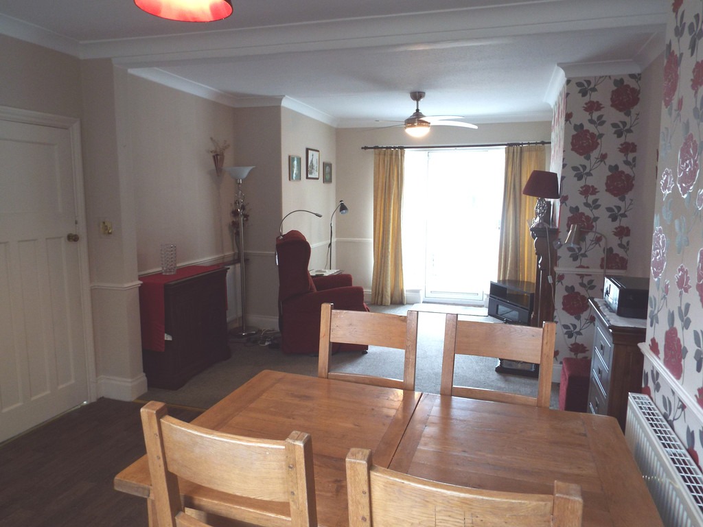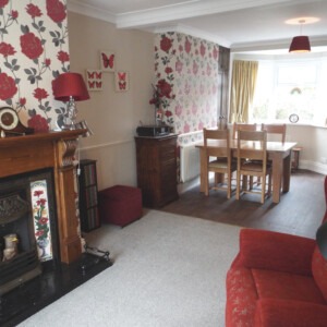 SPACIOUS LOUNGE/DINING AREA 25′ 2" x 13′ 0" (7.67m x 3.96m) With uPVC double glazed bay window which overlooks the front, feature fireplace, open fire with tiled inset and hearth, uPVC double glazed door with windows which lead to the rear, built-in cupboard, dado rail, cornice to the ceiling and two central heating radiators.