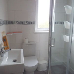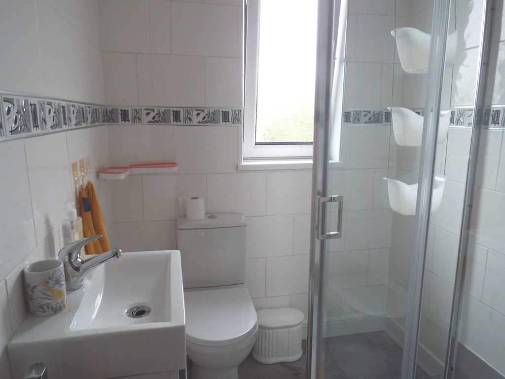 SHOWER ROOM 6′ 0" x 5′ 4" (1.83m x 1.63m) With shower cubicle, vanity wash hand basin, low level WC, fully-tiled walls, heated chrome towel rail, uPVC obscured double glazed window which overlooks the rear and extractor.