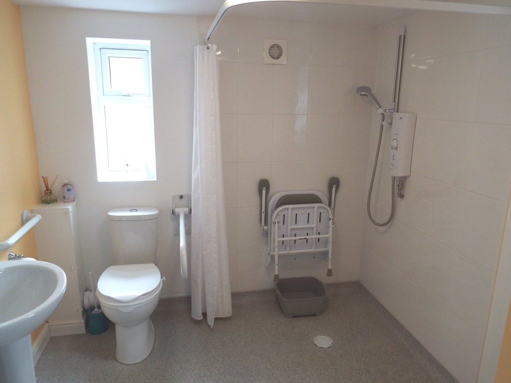 WET ROOM 7′ 8" x 7′ 5" (2.34m x 2.26m) With shower, pedestal wash hand basin, low level WC, extractor, two uPVC double glazed windows which overlook the side and rear and tall radiator.
