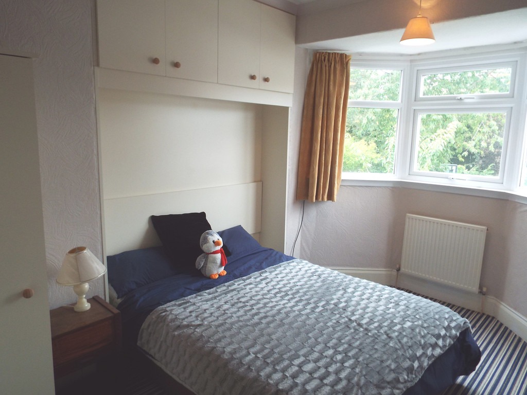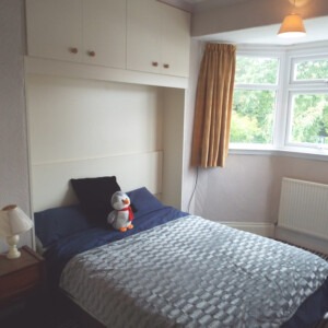 BEDROOM 2 11′ 3" x 11′ 10" (3.43m x 3.61m) With uPVC double glazed window which overlooks the rear, fitted wardrobes and overhead cupboards, TV point, built-in cupboard and single central heating radiator.