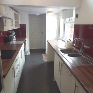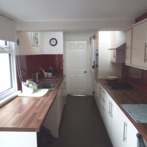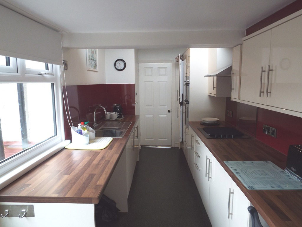FITTED KITCHEN 16′ 4" x 7′ 1" (4.98m x 2.16m) With a one and a half bowl stainless steel sink having drainer and mixer tap, fitted base and wall-mounted units, worktop surface areas, double central heating radiator, plumbing for automatic washing machine, extractor, integrated fridge/freezer, cornice to the ceiling, built-in double oven, 4 ring electric hob, uPVC double glazed window which overlooks the side and half uPVC double glazed entry door which leads to the rear garden.