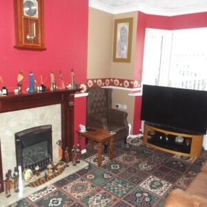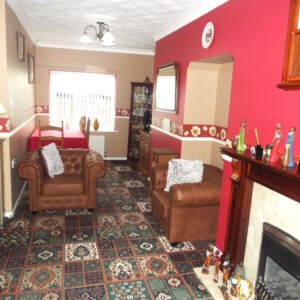 SPACIOUS THROUGH LOUNGE 26′ 6" x 10′ 10" (8.08m x 3.3m) Measurement narrows to 8’8. With uPVC double glazed bay window which overlooks the front, fireplace with surround and "marble" inset/hearth and fitted gas fire, cornice to the ceiling, dado rail, two double and one single central heating radiators, uPVC double glazed window which overlooks the rear, two roses to the ceiling, TV point.