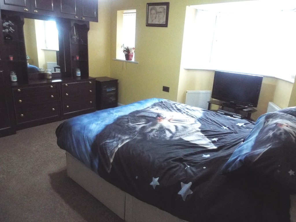 MASTER BEDROOM 14′ 4" x 13′ 6" (4.37m x 4.11m) Measured into bay. With uPVC double glazed bay window which overlooks the front, two single central heating radiators, fitted wardrobes with overhead cupboards and drawer unit, TV point.