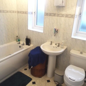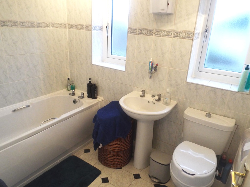 BATHROOM 8′ 4" x 5′ 9" (2.54m x 1.75m) With panelled bath having handle grips and separate shower over, walls are fully-tiled, pedestal wash hand basin, low level WC, single central heating radiator, two uPVC double glazed windows which overlook the rear, single central heating radiator, Xpelair.