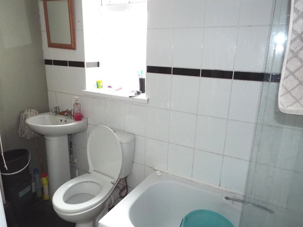 BATHROOM 8′ 11" x 3′ 11" (2.72m x 1.19m) With a panelled bath and mixer tap with shower attached over, pedestal wash hand basin, low level WC, extractor, uPVC obscured double glazed window which overlooks the side, tiled areas, wall-mounted heated chrome towel rail.