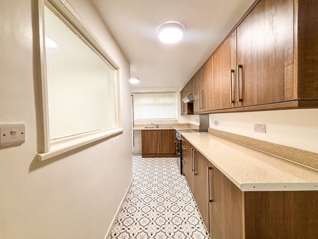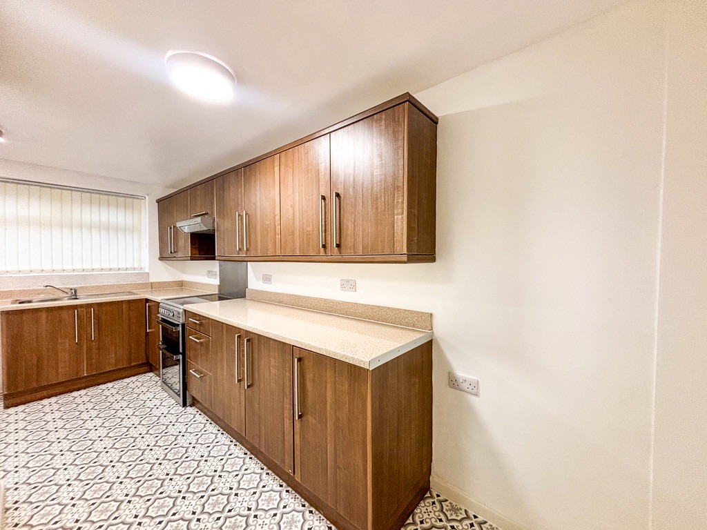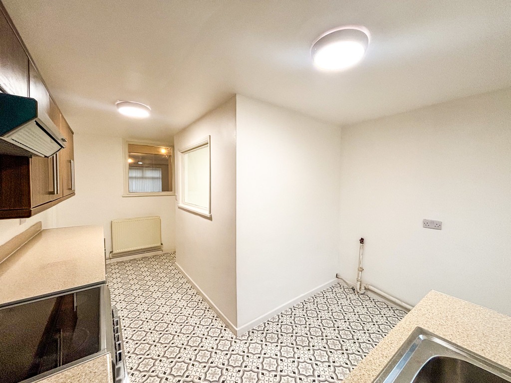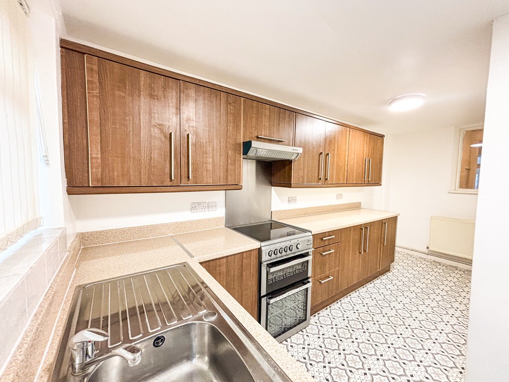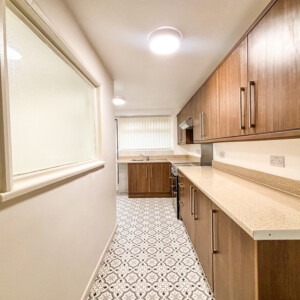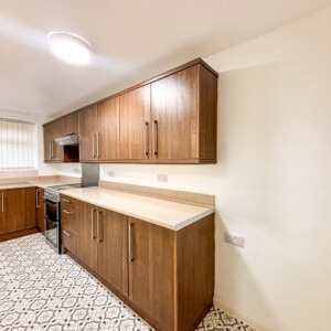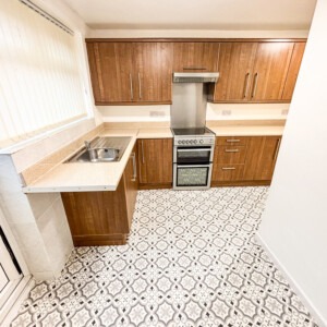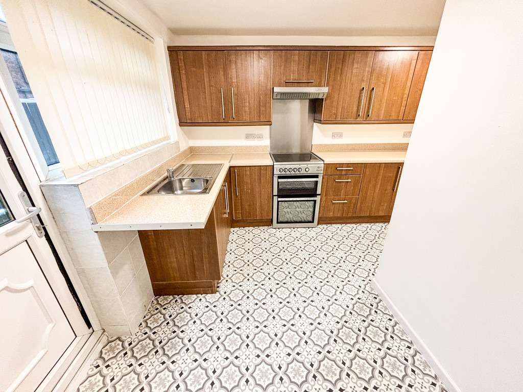 KITCHEN A modern and well-presented kitchen fitted with a range of wood-effect wall and base units, offering ample storage and generous worktop space. It includes a oven with hob and extractor hood, a stainless steel sink with drainer, and a window that lets in plenty of natural light. The kitchen provides direct access to the rear yard, making it practical for everyday use. Finished with contemporary patterned flooring, this kitchen combines style and functionality.
