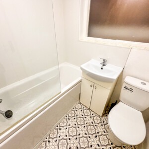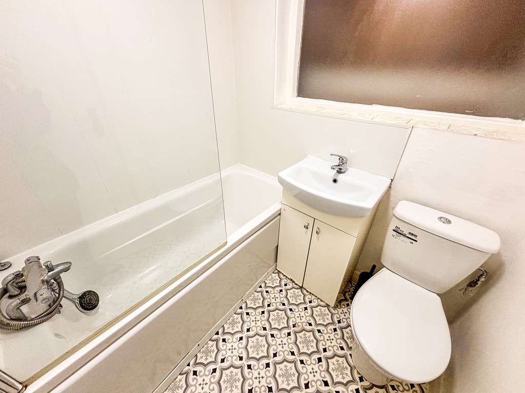 BATHROOM A clean and modern bathroom featuring a three-piece white suite comprising a bath, wash basin with storage underneath, and a toilet. The room is bright and fresh, with contemporary fittings and neutral décor, providing a comfortable and practical space.